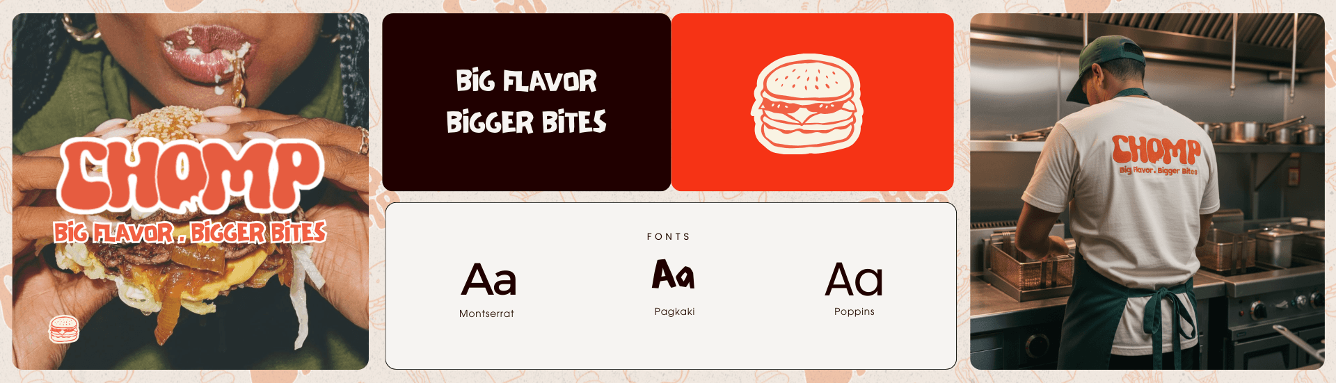 The branding direction began by defining a clear emotional vision: Chomp should feel bold, juicy, friendly, and unapologetically indulgent.